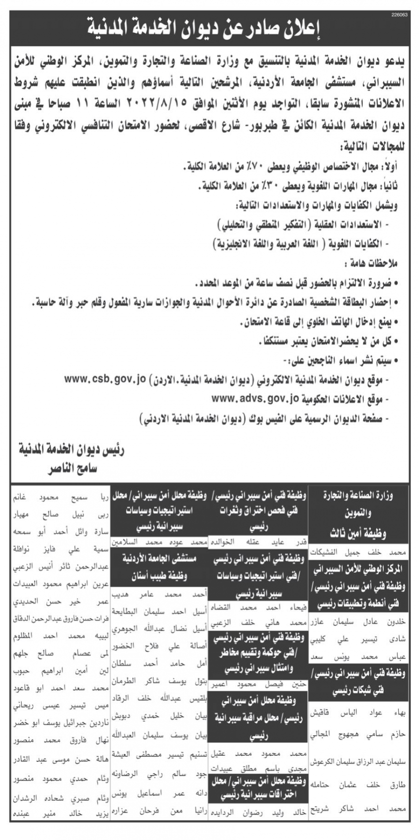 أعلن ديوان الخدمة المدنية بالتنسيق مع وزارة الصناعة والتجارة، والمركز الوطني للأمن السيبراني، ومستشفى الجامعة الأردنية، عن دعوة مجموعة من المرشحين لحضور الامتحان التنافسي.