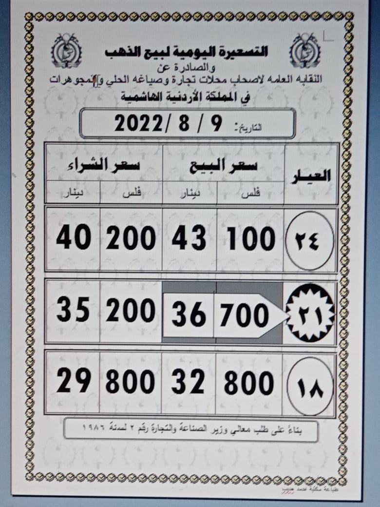 وبلغ سعر بيع غرام الذهب عيار 21 الأكثر رغبة من الأردنيين بالسوق المحلية عند 36,70 دينارا لغايات شراء المواطنين من محلات الصاغة.