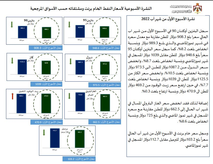 ووفق نشرة وزارة الطاقة، فقد سجل البنزين أوكتان 90 في الأسبوع الأول من شهر آب الحالي سعرا بلغ 908.3 دولار للطن مقارنة مع معدل سعره في شهر تموز الماضي والذي بلغ 989.3 دولار وبنسبة انخفاض بلغت 8.2%.