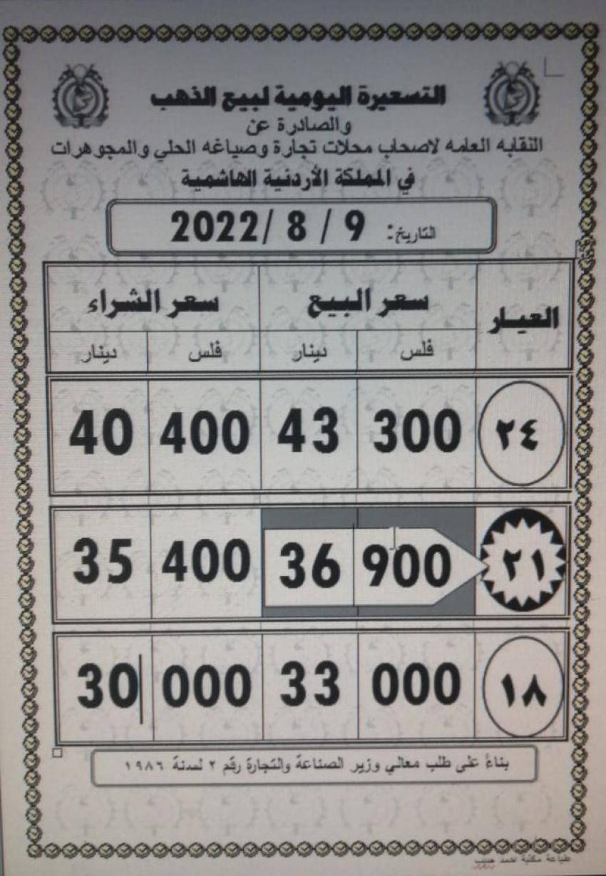 وبلغ سعر بيع الغرام من الذهب عياري 24 و18 لغايات الشراء من محلات الصاغة عند 43.30 و 33 دينارا على التوالي.