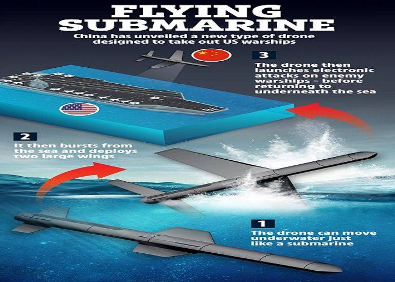 علماء الصين يعملون على بناء غواصات طائرة مصممة لتنفجر من الماء وتحلق في السماء بأجنحة قابلة للطي.