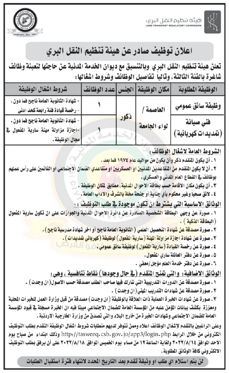 : أعلنت هيئة تنظيم النقل البري بالتنسيق مع ديوان الخدمة المدنية عن حاجتها لتعبئة وظائف شاغرة بالفئة الثالثة.