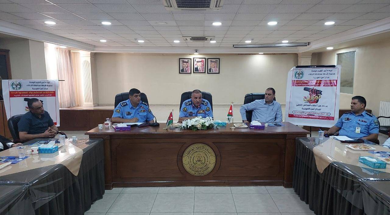 رعى مدير شرطة محافظة الزرقاء العميد رائد أبو السمن اليوم الأربعاء في غرفة تجارة الزرقاء إطلاق مبادرة "توقف، لا تقتلني بفرحك'  لمكافحة إطلاق العبارات النارية التي ينظمها المجلس المحلي لمركز أمن الغويرية لتوعية المواطنين إلى خطر إطلاق العبارات النارية في الأفراح والمناسبات تزامنا مع قرب إعلان نتائج الثانوية العامة، وحضر اللقاء مدير مركز أمن الغويرية المقدم بشار العبادي ورئيس قسم الأمن الوقائي الرائد شفيق المحاميد ورئيس فرع الشرطة المجتمعية النقيب عمران الخوالدة وأعضاء المجلس المحلي لمركز أمن الغويرية .