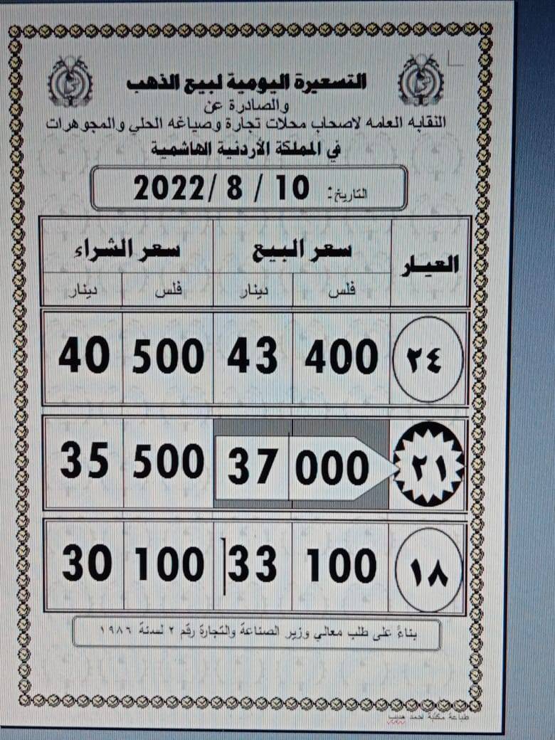 حيث بلغ سعر شراء غرام الذهب عيار 21 وهو الاكثر رغبة بين المواطنين 37.00 دينارا، فيما بلغ سعر البيع للصاغة 35.50.