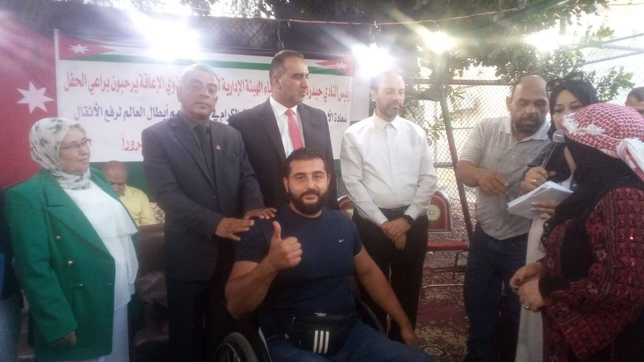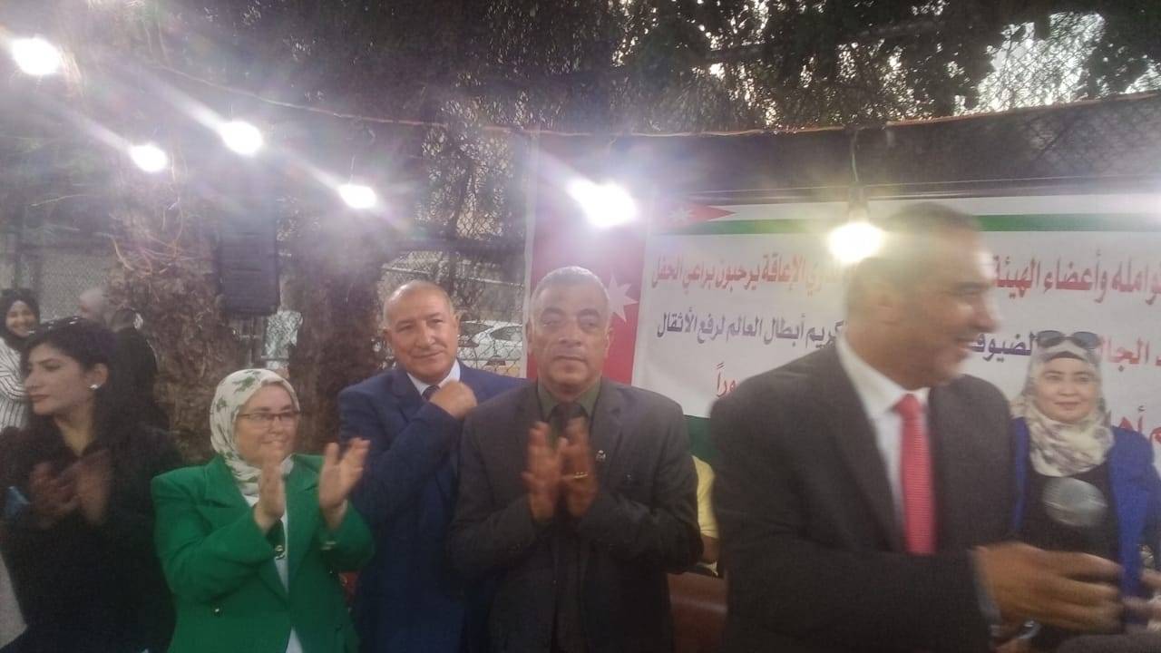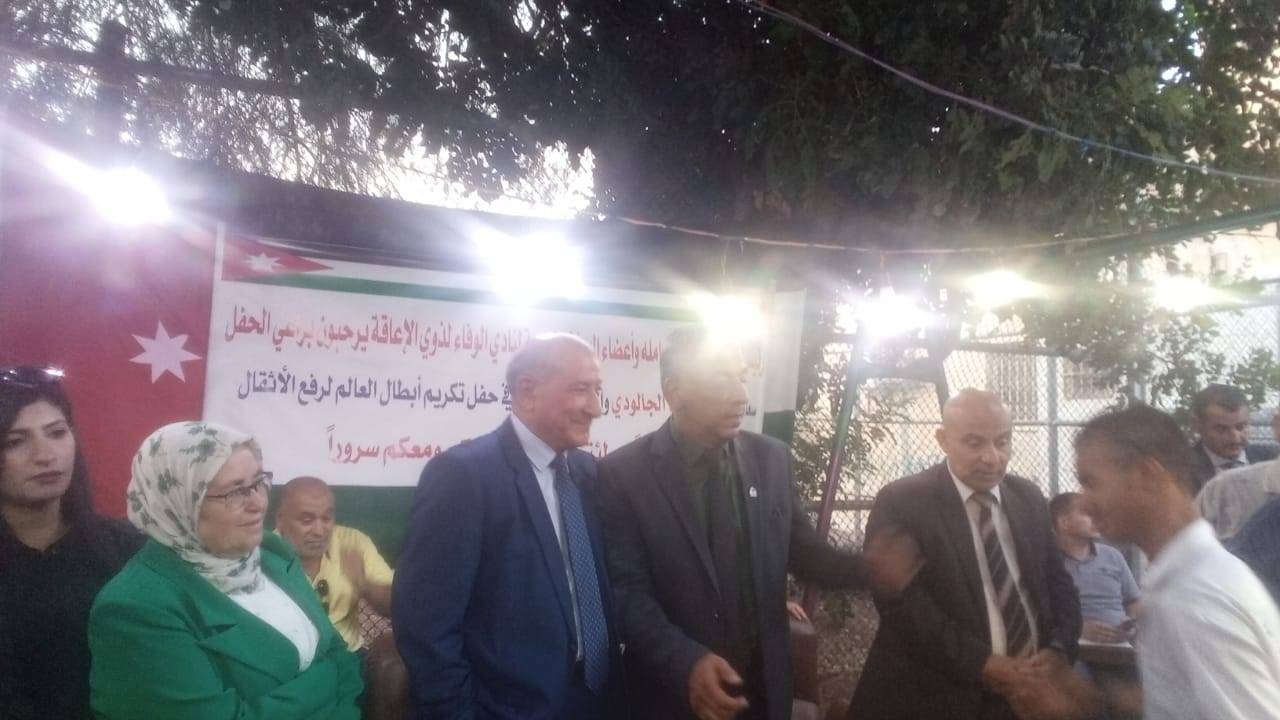 برعاية النائب الأسبق أحمد الجالودي وبحضور السفير عبدالله العفيشات سفير النوايا الحسنة وعددا كبير من الشخصيات الرياضية والاجتماعية أقيم في نادي الوفاء لذوي الإعاقة مساء اليوم تكريما لأبطال العالم في رفع الأثقال