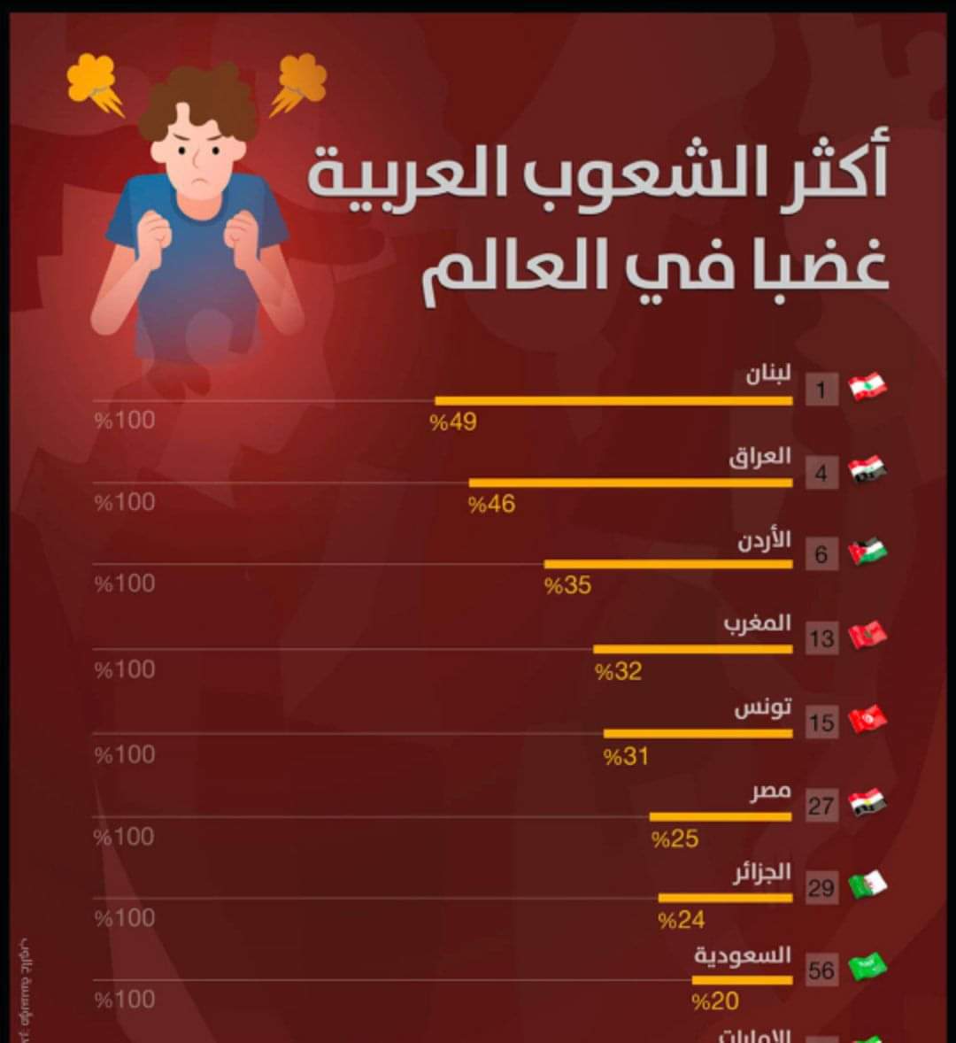 وفيما يلي ترتيب الدول العربية "الأكثر غضباً" على المؤشر: