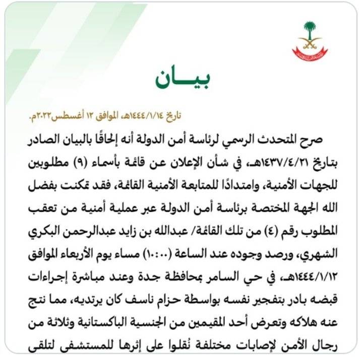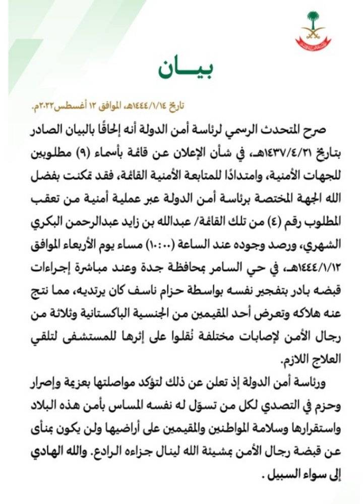 : أعلنت رئاسة أمن الدولة السعودية،عن مقتل الإرهابي المطلوب منذ 7 أعوام عبدالله بن زايد البكري، الشهري بتفجير نفسه بعد محاصرته في جدة مساء الأربعاء، وإصابة مقيم باكستاني وثلاثة من رجال الأمن.