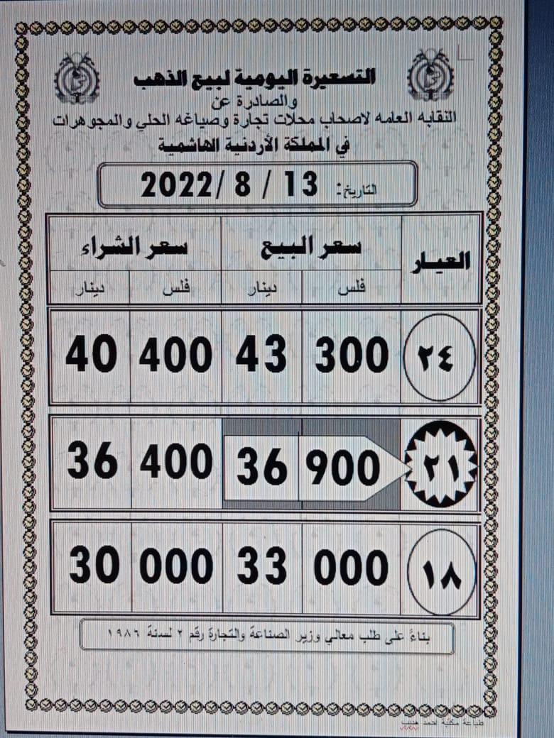 وبلغ سعر بيع غرام الذهب عيار 21 الأكثر رغبة من الأردنيين بالسوق المحلية عند 36,90 دينارا لغايات شراء المواطنين من محلات الصاغة.