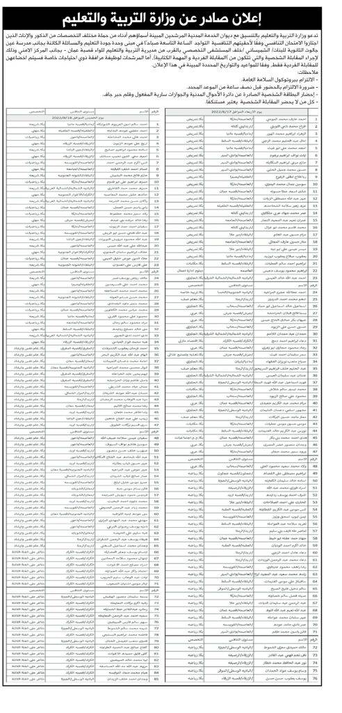 دعت وزارة التربية والتعليم بالتنسيق مع ديوان الخدمة المدنية، مرشحين ممن اجتازوا الامتحان التنافسي، لإجراء المقابلة الشخصية.