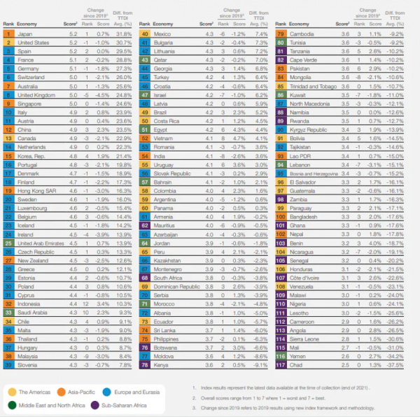 وحصل الأردن على المرتبة الـ64 في مؤشر تنافسية قطاع السياحة والسفر TTDI على مستوى 117 دولة MAY 2022 والصادر عن المنتدى الاقتصادي العالمي World Economic Forum عام 2021.