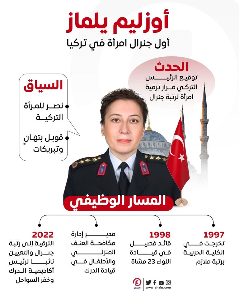 الترقية كانت من نصيب أوزليم يلماز، التي كانت في رتبة عقيد، وتدير القيادة العامة لمكافحة العنف المنزلي والأطفال، وأصبحت بتوقيع الرئيس أردوغان، أول جنرال نسائي في تركيا.