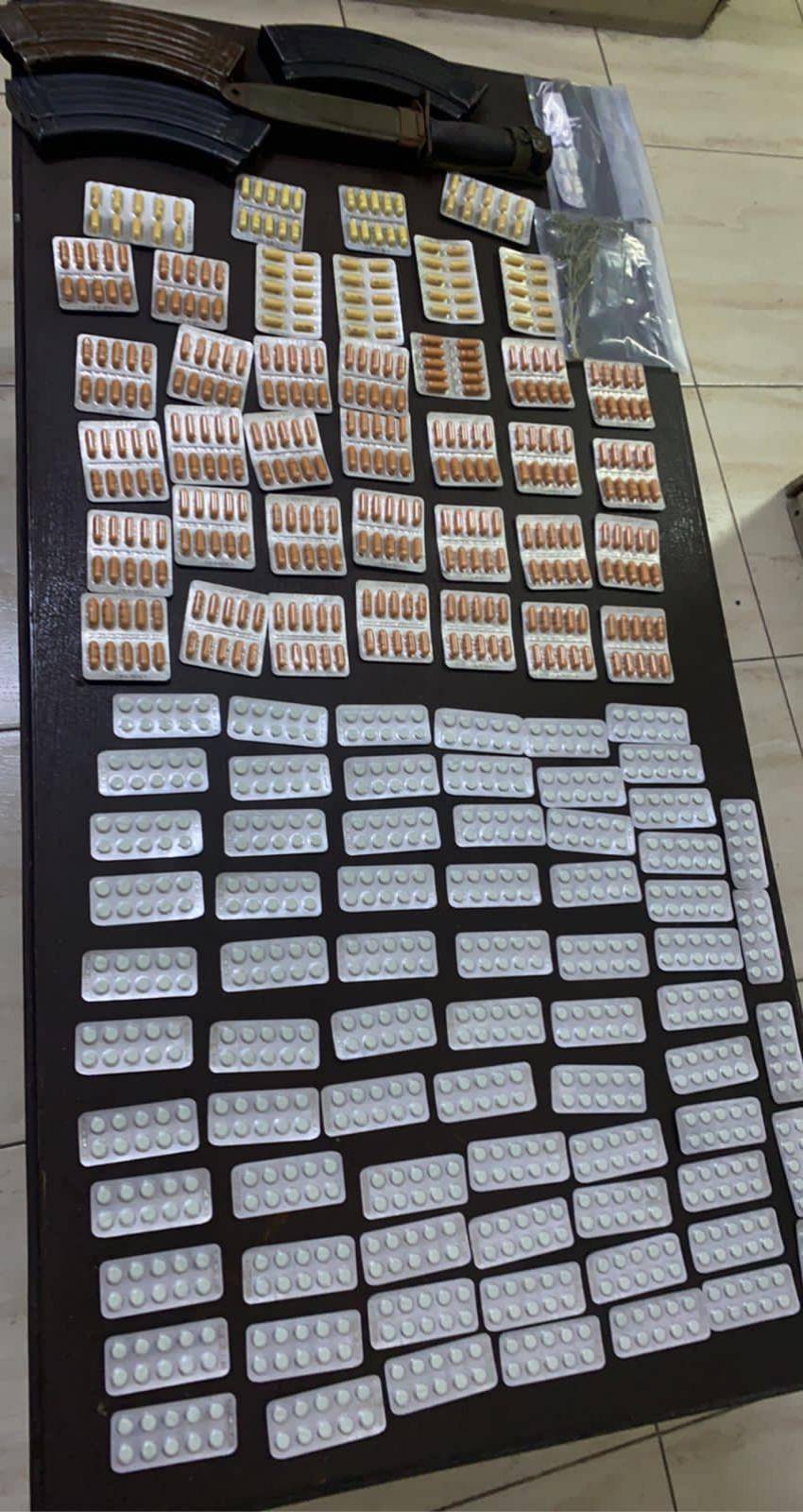 وبين الناطق الإعلامي أن قوة أمنية القت القبض في مداهمة على شقيقين وردت معلومات حول قيامهما بحيازة وبيع المواد المخدرة، وضُبط بحوزتهما 8 كفوف من مادة الحشيش المخدرة وكميات كبيرة من مادة الماريجوانا المخدرة المعدة للبيع، وكمية من الحبوب المخدرة، وسلاحان ناريان.