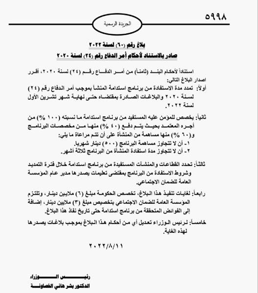 أصدر رئيس الوزراء بشر الخصاونة بلاغ رقم (60) لسنة 2022 / صادر بالاستناد لأحكام أمر الدفاع رقم (24) لسنــــة 2020.