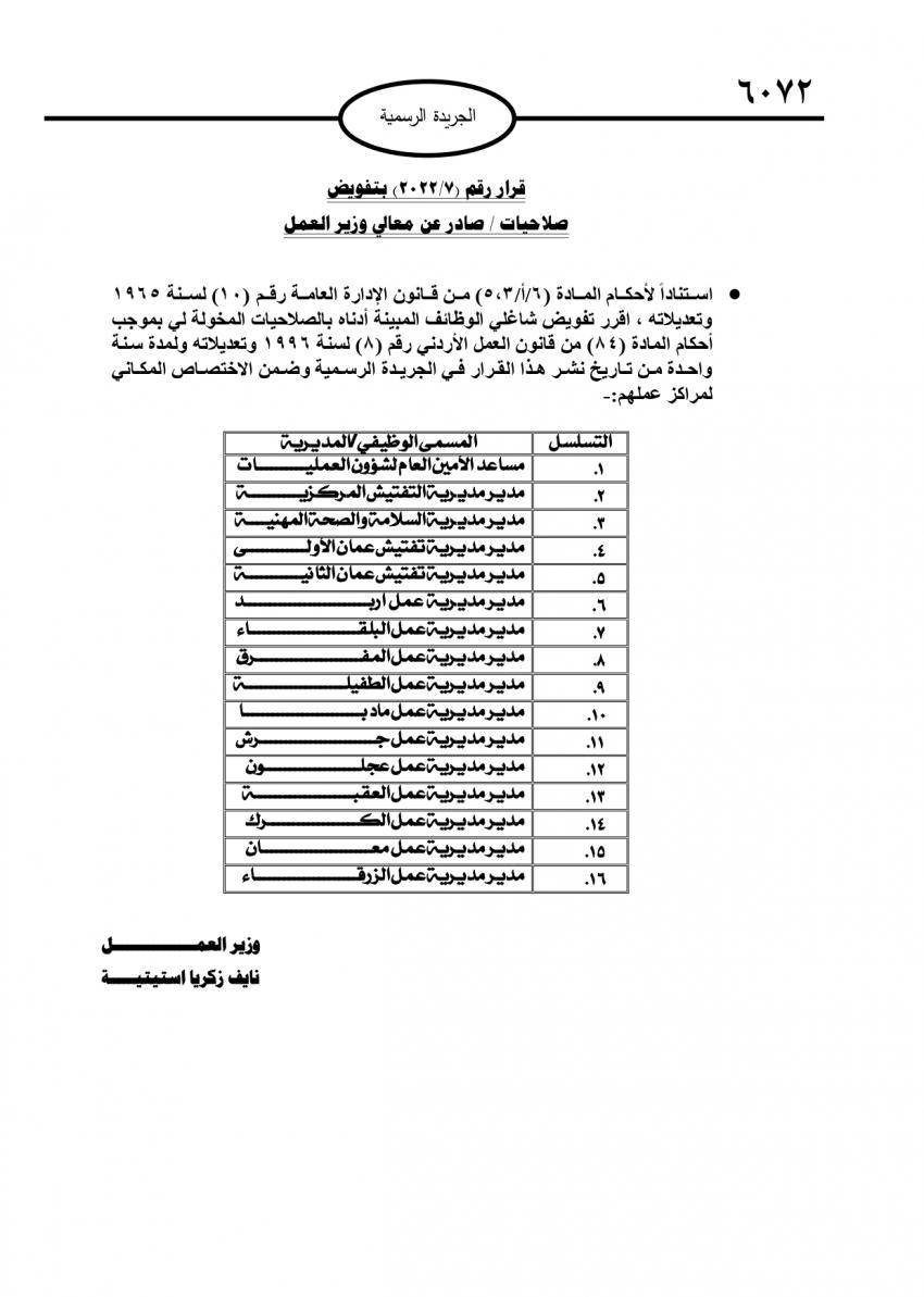 ونقل استيتية الصلاحيات إلى كل من؛ مساعد الأمين العام لشؤون العمليات، ومدير مديرية التفتيش المركزية، ومدير مديرية السلامة والصحة المهنية، ومدير مديرية تفتيش عمان الأولى، ومدير مديرية تفتيش عمان الثانية، ومدير مديرية عمل إربد، ومدير مديرية عمل البلقاء، ومدير مديرية عمل المفرق، ومدير مديرية عمل الطفيلة، ومدير مديرية مأدبا، ومدير مديرية عمل جرش، ومدير مديرية عمل عجلون، ومدير مديرية عمل العقبة، ومدير مديرية عمل العقبة، ومدير مديرية عمل الكرك، ومدير مديرية عمل معان، ومدير مديرية الزرقاء.