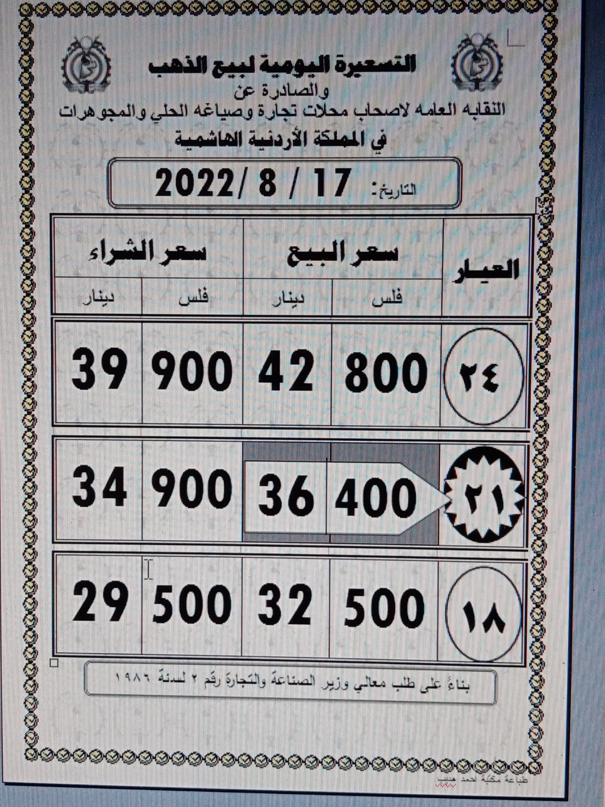 ووفق نقابة أصحاب محلات تجارة وصياغة الحلي والمجوهرات، فقد بلغ سعر بيع غرام الذهب عيار 21 الأكثر رغبة من الأردنيين بالسوق المحلية عند 36.40 دينارا لغايات شراء المواطنين و 34.90 لغاية البيع.