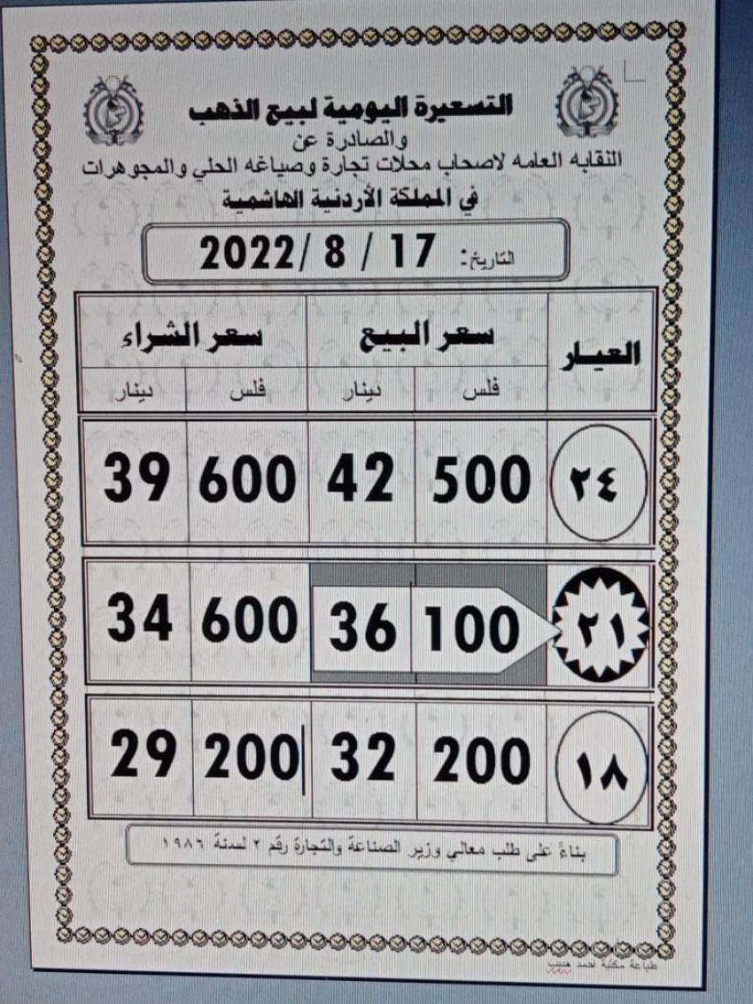 وبلغ سعر غرام الذهب عيار 21 عند 36،10 دينارا، لجهة الشراء من المحلات مقابل 34،60 دينارا لجهة البيع.