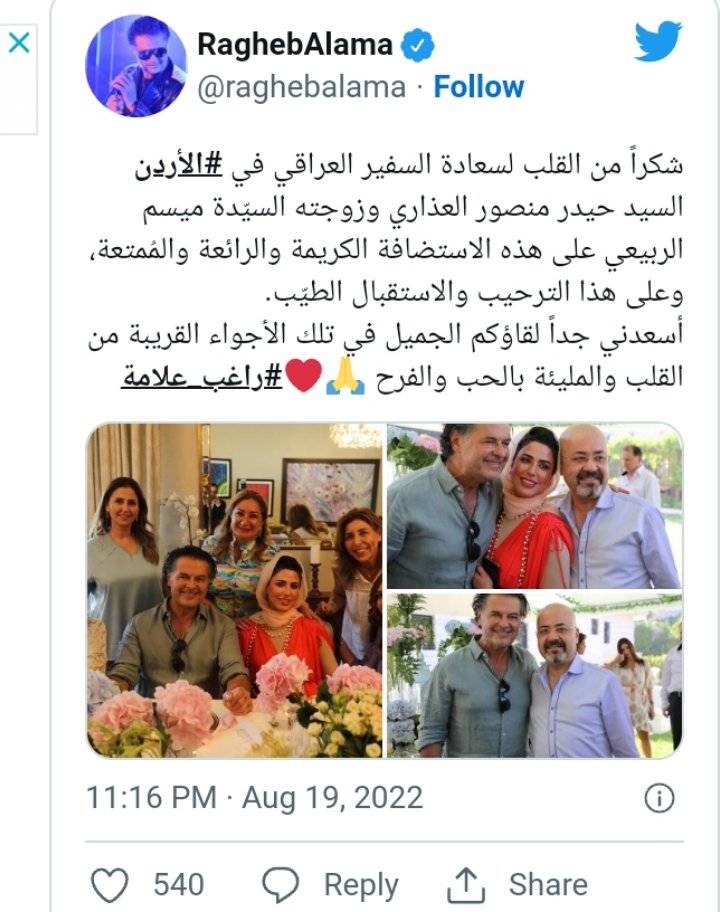 وكتب علامة في حسابه على تويتر: "شكرا من القلب لسعادة السفير العراقي في #الأردن السيد حيدر منصور العذاري وزوجته السيّدة ميسم الربيعي على هذه الاستضافة الكريمة والرائعة والمُمتعة، وعلى هذا الترحيب والاستقبال الطيّب. أسعدني جداً لقاؤكم الجميل في تلك الأجواء القريبة من القلب والمليئة بالحب والفرح #راغب_علامة".