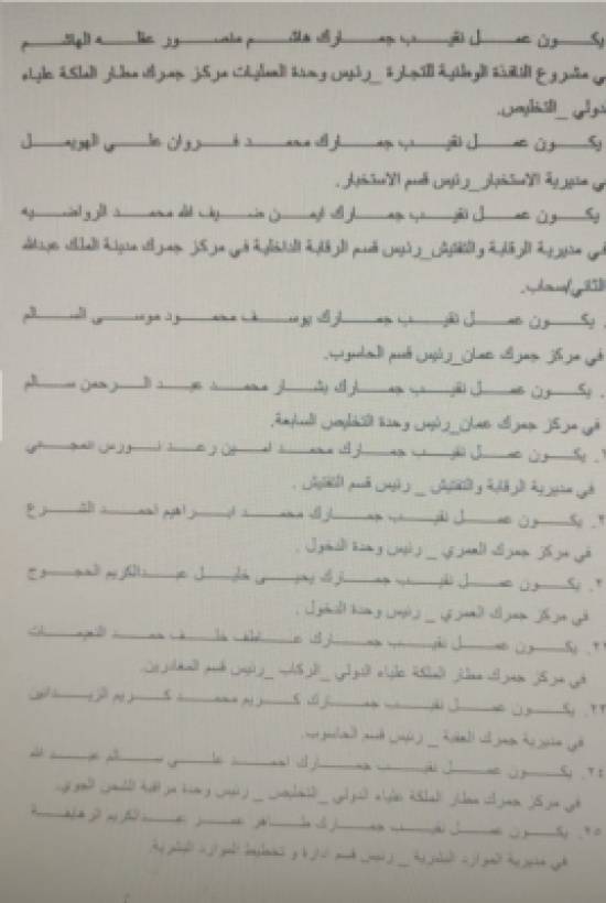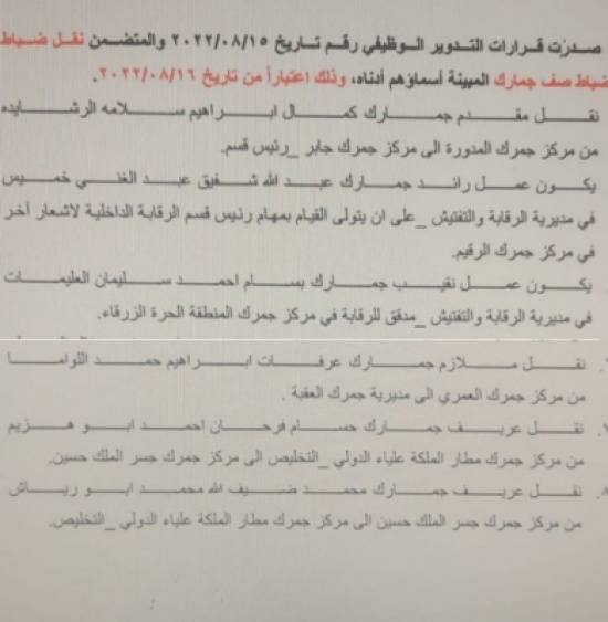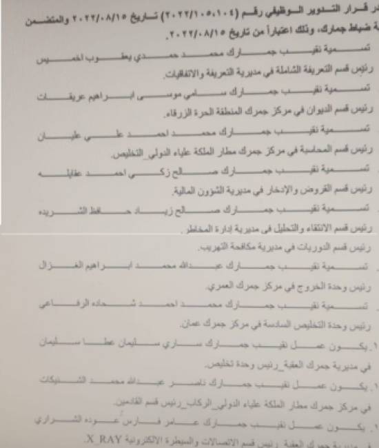 قرر مدير عام دائرة الجمارك اللواء المهندس جلال القضاة اجراء تشكيلات لضباط وضباط صف الجمارك في مختلف الدوائر.