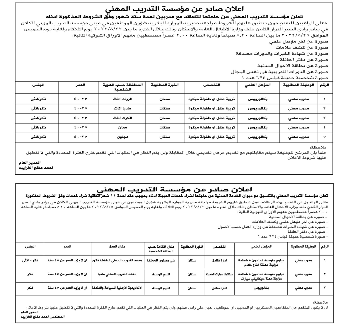 ودعت الراغبين في التقدم للشواغر، إلى مراجعة مقر المؤسسة، خلال الفترة ما بين 23/8/2022 ولغاية 26/8/2022.