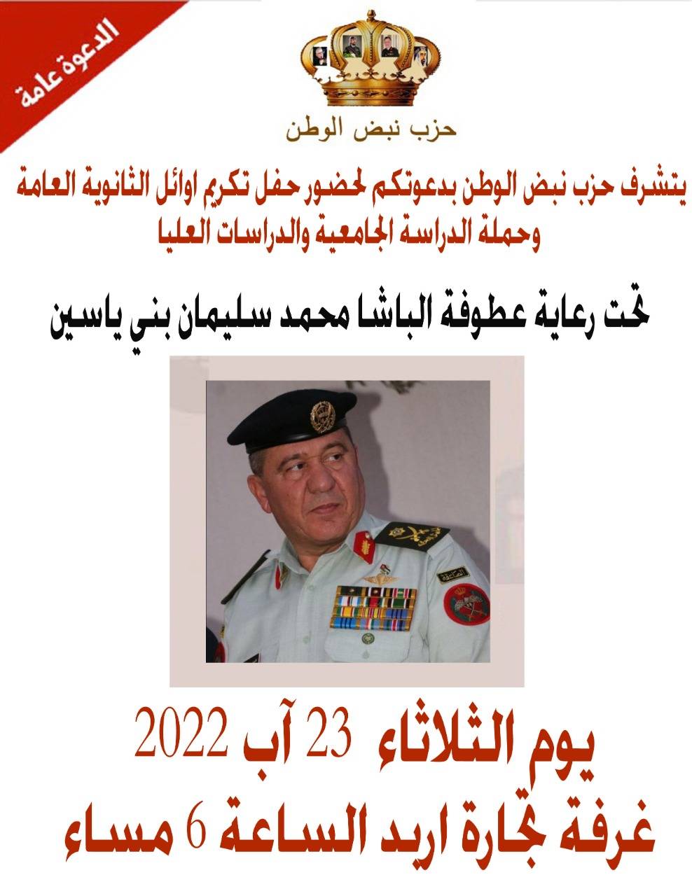 تحت رعاية الباشا محمد سليمان بني ياسين ،دعا حزب نبض وطن ، رئيس وأعضاء ملتقى صناع الخير تحت التأسيس لمنطقة :حور, وتقبل, واسعره ,وفوعرا ,وام الجدايل ، لحضور حفل تكريم أوائل الثانوية العامة وحملة الدراسة الجامعية والدراسات العليا .