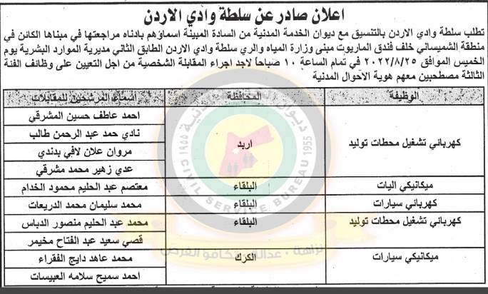 طلبت سلطة وادي الأردن بالتنسيق مع ديوان الخدمة المدنية أسماء مرشحين للتعيين وذلك لإجراء مقابلة شخصية .