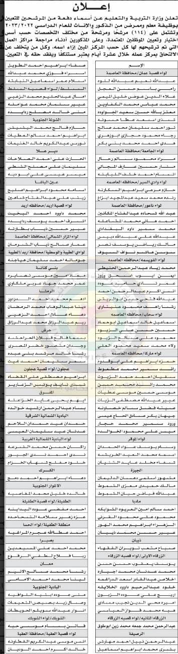 أعلنت وزارة التربية والتعليم بالتنسيق مع ديوان الخدمة المدنية اليوم الاربعاء، استكمال إجراءات تعيين 114 مرشحاً ومرشحة لوظائف معلم وممرض من الذكور والإناث.