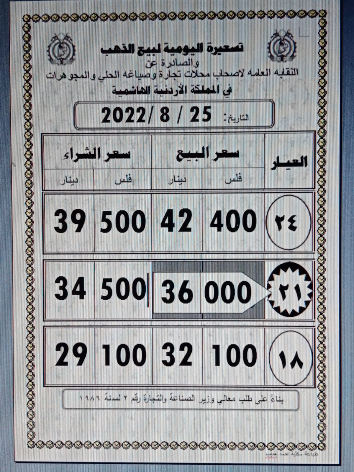 ووفق نقابة أصحاب محلات تجارة وصياغة الحلي والمجوهرات، فقد بلغ سعر بيع غرام الذهب عيار 21 الأكثر رغبة من الأردنيين بالسوق المحلية عند 36.00 دينارا لغايات شراء المواطنين.