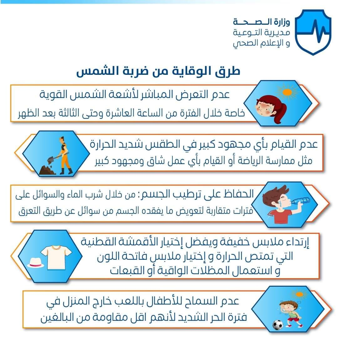 نيروز الإخبارية : نشرت مديرية التوعية والإعلام الصحي في وزارة الصحة ارشادات وطرق للوقاية من ضربة الشمس في ظل ارتفاع درجات الحرارة.
