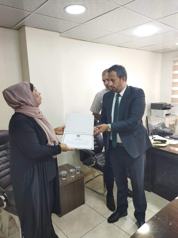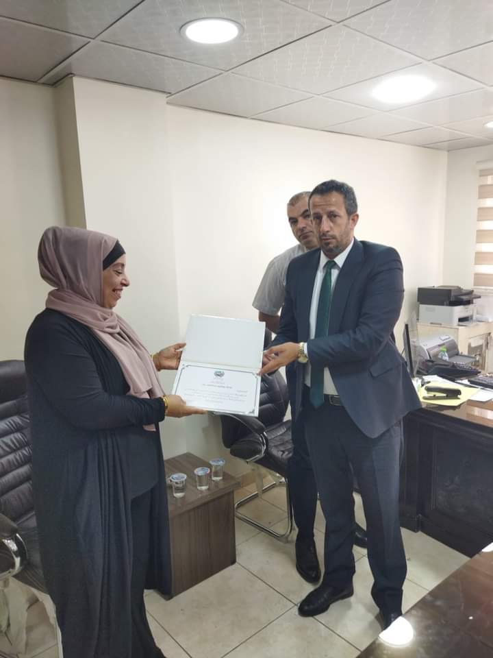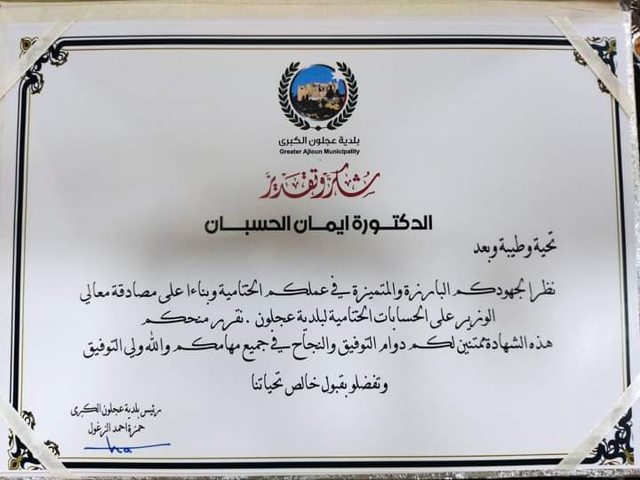الوزاره الدكتوره ايمان الحسبان على الجهود المتميزه التي بذلتها خلال فترة عملها وتدقيقها  الحسابات الختامية وموازنة البلدية .