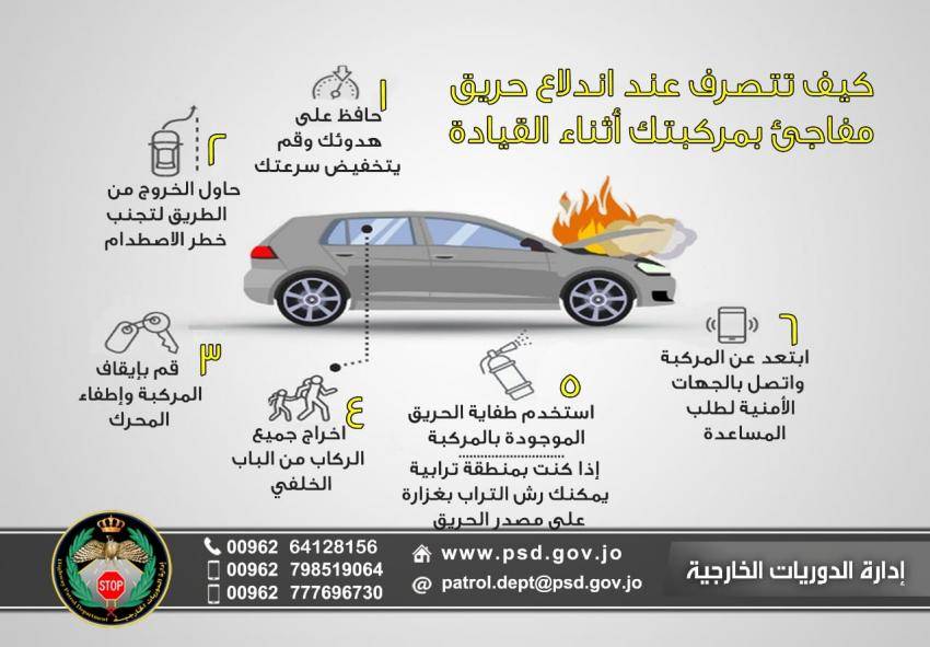 ونشرت الدوريات الخارجية عبر صفحتها بالفيسبوك الأحد، مجموعة من الارشادات والنصائح للسائقين عند مواجهة اندلاع حريق مفاجئ بالمركبة أثناء القيادة، جاءت كما يلي: