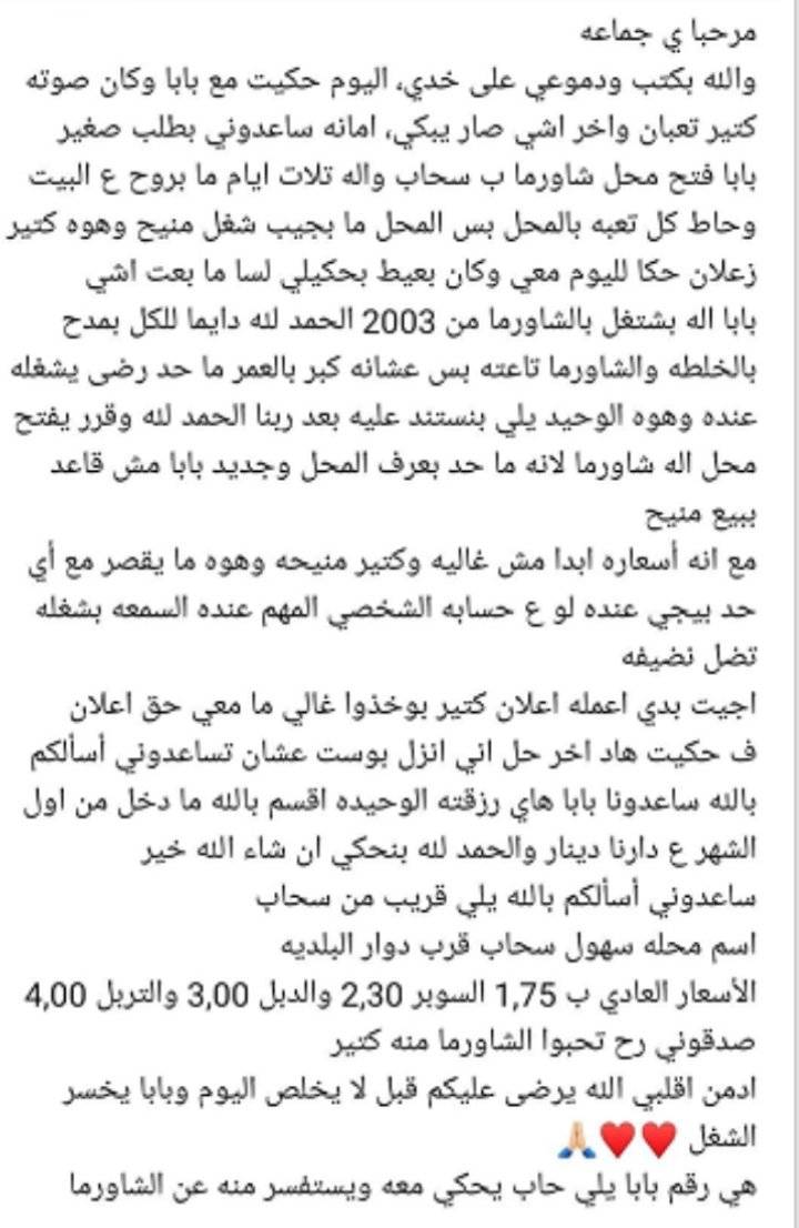 نشرت فتاة اردنية مناشدة عبر مواقع التواصل الاجتماعي لإنقاذ مطعم والدها الذي تردت احواله مؤخرا بحسب قولها .