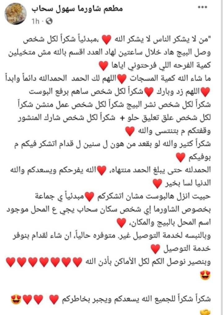 وفي اقل من ساعات من نشر المناشدة انهالت طلبات الشراء على المطعم الكائن جنوبي العاصمة عمان الذي اصبح حديث الرأي العام بعد مناشدة الفتاة .