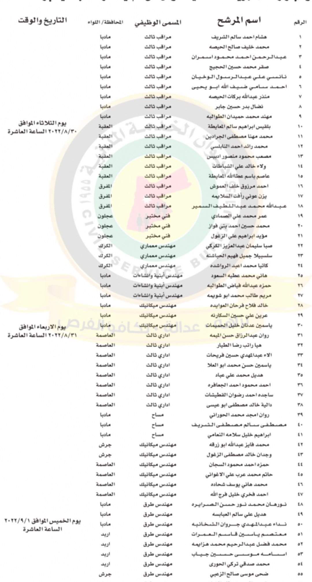 أعلنت وزارة الاشغال العامة والإسكان وبالتنسيق مع ديوان الخدمة المدنية عن موعد إجراء المقابلات الشخصية للاسماء التالية:
