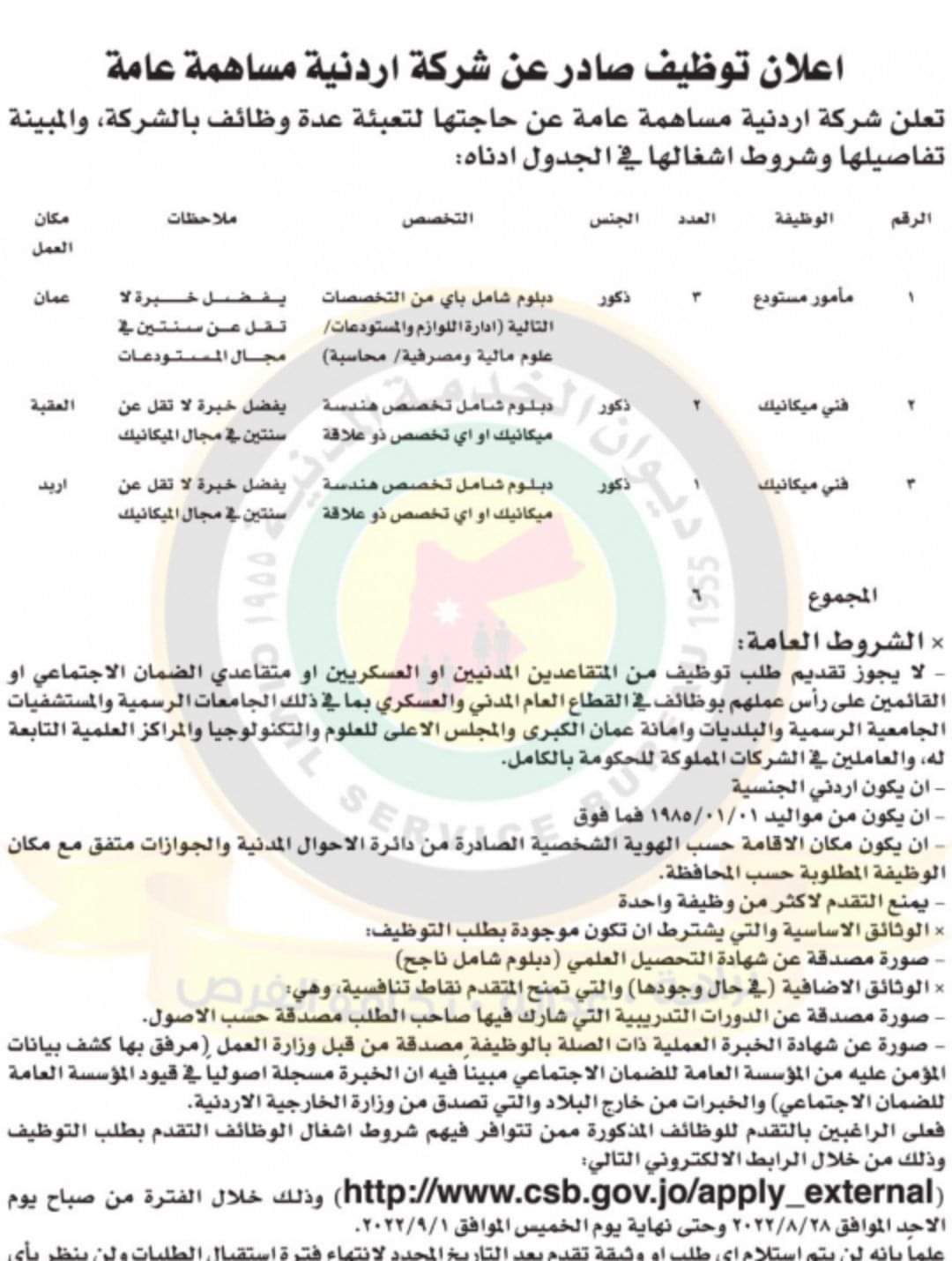 أعلنت شركة اردنية مساهمة عامة عن حاجتها لتعبئة عدة وظائف بالشركة بالتعاون مع ديوان الخدمة المدنية .