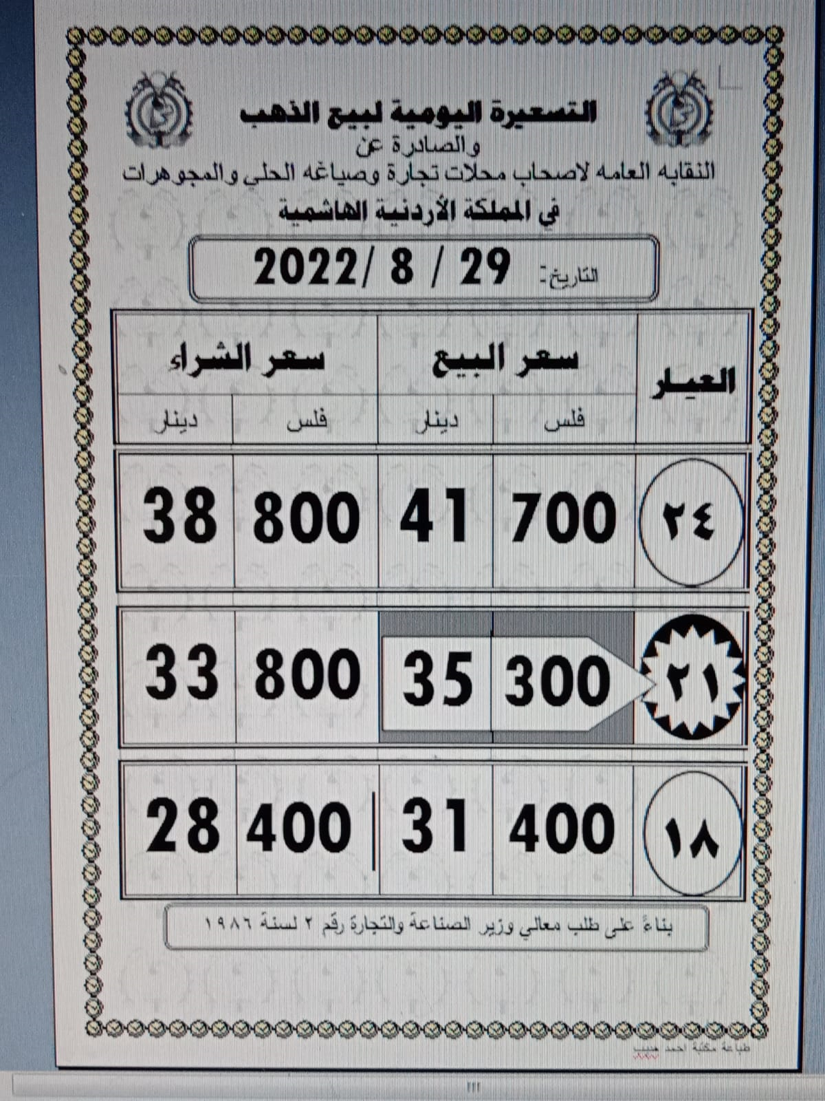 ووفق نقابة أصحاب محلات تجارة وصياغة الحلي والمجوهرات، فقد بلغ سعر بيع غرام الذهب عيار 21 الأكثر رغبة من الأردنيين بالسوق المحلية عند 35.30 دينارا لغايات شراء المواطنين.