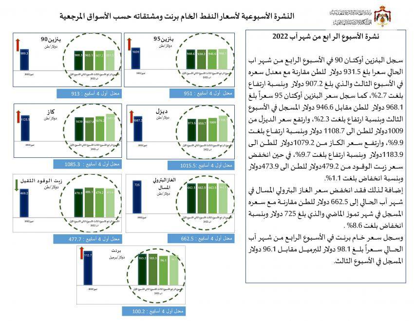وبحسب النشرة الاسبوع الرابع سجل سعر خام برنت 98.1 دولارا للبرميل مقابل 96.1 دولارا للاسبوع الثالث من شهر آب الحالي .