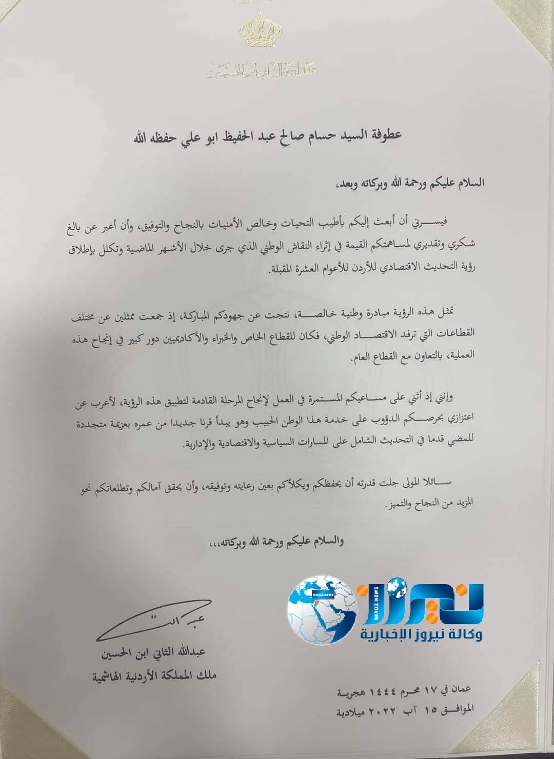 وتاليا الرسالة التي وجهها جلالته للسيد حسام صالح عبد الحفيظ أبو علي :