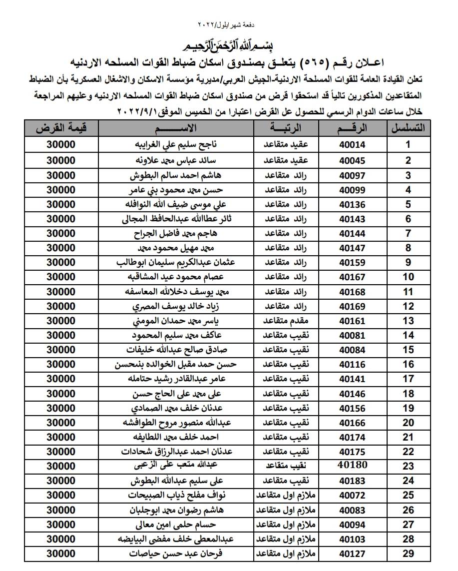 أعلنت القيادة العامة للقوات المسلحة الأردنية_ الجيش العربي/ مديرية مؤسسة الإسكان والأشغال العسكرية بأن الضباط وضباط الصف والأفراد المبينة أسمائهم أدناه قد استحقوا قرض الإسكان العسكري.