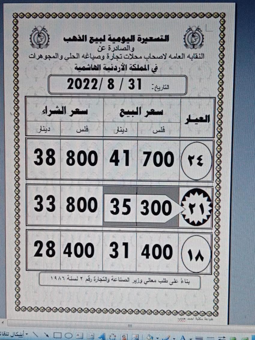 وبلغ سعر غرام الذهب عيار 21 الاكثر طلبا عند 35.30 دينارا لجهة البيع للمواطنين، مقابل 3.80 دينارا لجهة الشراء .