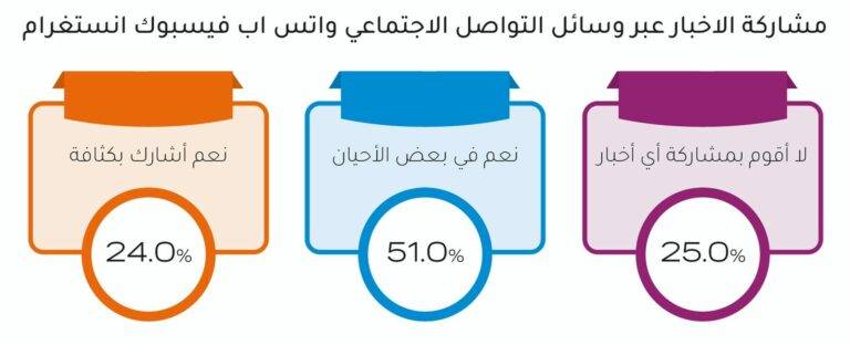 وخلصت الدراسة إلى أن 75% من الأردنيين يقومون بنشر الأخبار على منصات التواصل الاجتماعي، منهم 17% فقط يبادر بالتعبير عن رأيه حول الأخبار التي يتم نشرها والآخرون يكتفون بنشر الأخبار دون التعبير عنها، بينما قال 25% من الأردنيين والأردنيات إنهم لا يقومون بمشاركة أي أخبار يجدونها على منصات التواصل الاجتماعي.