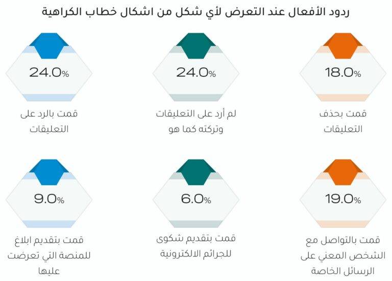 وبيّنت النتائج أن 51% من الأردنيين والأردنيات يعتقدون بأنهم يعرفون مفهوم خطاب الكراهية بشكلٍ متوسط، و20% قالوا بأنهم يعرفون مفهوم خطاب الكراهية بشكل محدود، و29% يعرفون مفهوم خطاب الكراهية بشكل كبير. وحول ردود فعلهم عند التعرض لأي شكل من أشكال خطاب الكراهية، أوضح 18% أنهم قاموا بحذف التعليقات، فيما 24% تركوا التعليقات التي تحتوي على خطاب كراهية ولم يحذفوها أو يردوا عليها، و24% قالوا إنهم أبقوا التعليقات وردوا عليها، بينما وصلت نسبة من قاموا بالتواصل المباشر مع الشخص المعني من خلال الرسائل الخاصة 19%، و6% قالوا إنهم تقدموا بشكوى لدى وحدة الجرائم الالكترونية، و9% قالوا إنهم تقدموا بإبلاغ للمنصة ضد الشخص المعني.
