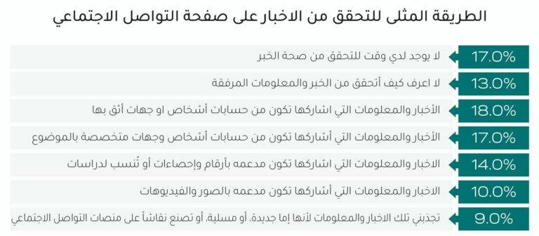 وفيما يتعلق بالتحقّق من صحة الأخبار المنشورة، قال 17% من الأردنيين والأردنيات إنهم لا يملكون وقتًا للتحقق من صحة الأخبار التي يقرؤونها، و13% قالوا إنهم لا يعرفون كيفية التحقّق من صحة الأخبار المنشورة، وقال 18% إنهم يشاركون الأخبار التي ينشرها أشخاص أو جهات يثقون بها، و17% قالوا إنهم ينشرون الأخبار من جهات متخصّصة بالموضوع.