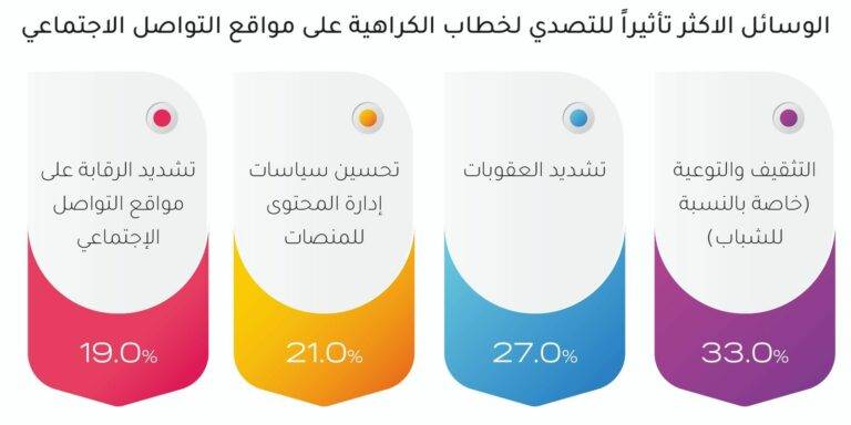 وعند سؤال المستجيبين عن الوسائل الأكثر تأثيرًا في مجابهة خطاب الكراهية، تبيّن أن 33% من الأردنيين والأردنيات يرون أن التثقيف والتوعية هي الوسيلة الأنسب، بينما رأى 27% أنه يجب تشديد العقوبات، و19% قالوا إن هناك ضرورة لتشديد الرقابة على مواقع التواصل الاجتماعي. فيما اعتبر 21% أن هنالك حاجة لتحسين سياسات إدارة المحتوى المنشور على منصات التواصل الاجتماعي.