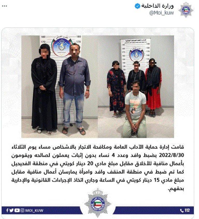 ونشرت الداخلية الكويتية صورا مموهة لوجوه المضبوطين، وقالت إن الإدارة العامة للمباحث الجنائية تمكنت من ضبط 20 شخصا من جنسيات مختلفة في محافظتي الفروانية والأحمدي منهم 14 من النساء – و6 رجال، يقومون بالأعمال المنافية للآداب وسمسرة مقابل مبالغ مالية.