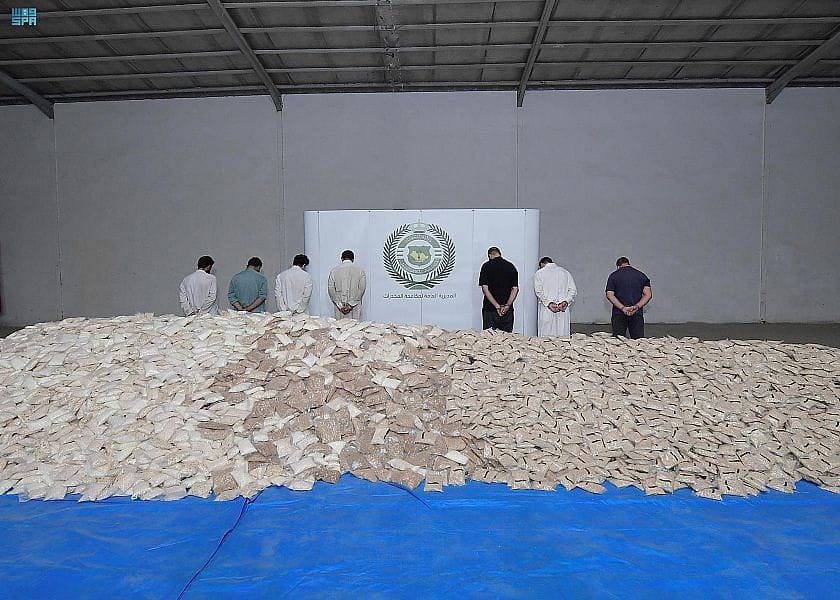 وتمت مداهمة الموقع والقبض على المشاركين في تهريبها وعددهم (8) مقيمين، (6) من الجنسية السورية و(2) من الجنسية الباكستانية، بحوزتهم (46.916.480) قرصًا من مادة الإمفيتامين المخدر مخبأة داخل شحنة طحين، وذلك بالتنسيق مع هيئة الزكاة والضريبة والجمارك.