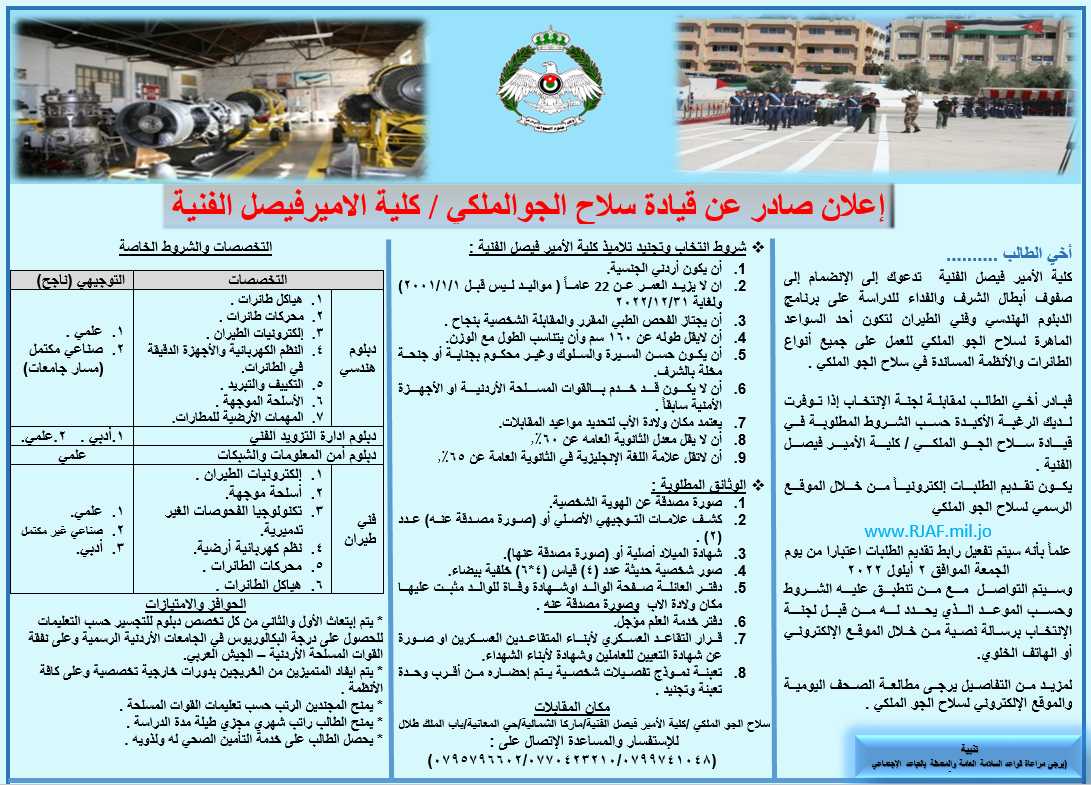 ودعت الطالب الى المبادرة لمقابلة لجنة الانتخاب في قيادة سلاح الجو الملكي / كلية الأمير فيصل الفنية – ماركا الشمالية/ باب الملك طلال إذا توفرت لديه الرغبة الأكيدة والشروط المطلوبة.