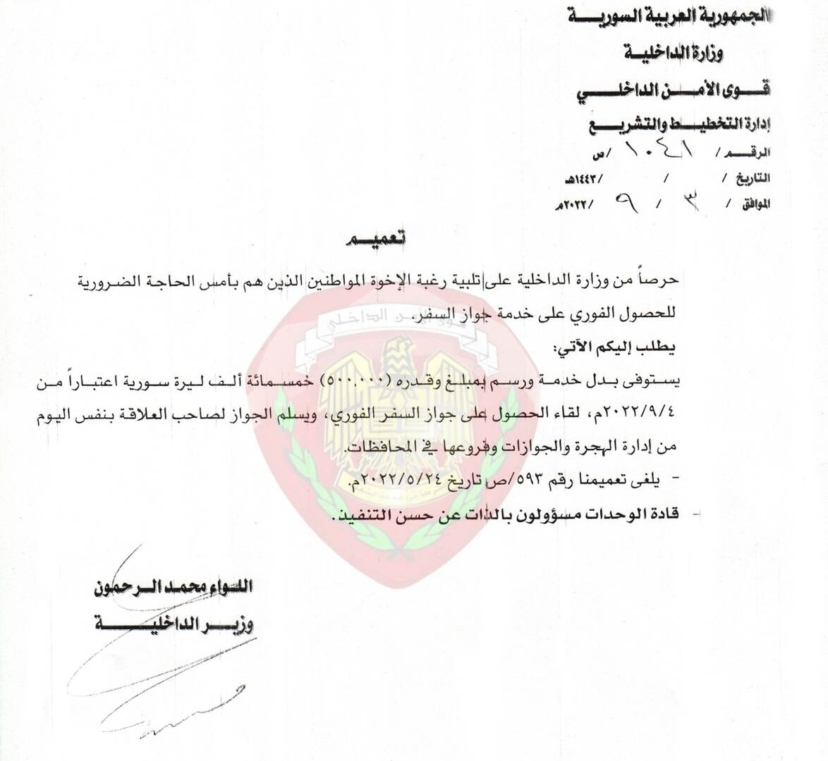 نيروز الإخبارية : أصدرت وزارة الداخلية السورية رسما جديدا فيما يخص إصدار جواز سفر مستعجل، "يسلم في ذات اليوم".
