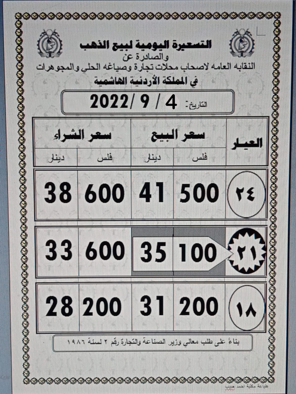 ووفق نقابة أصحاب محلات تجارة وصياغة الحلي والمجوهرات، فقد بلغ سعر بيع غرام الذهب عيار 21 الأكثر رغبة بين الأردنيين بالسوق المحلية عند 35.10 دينارا لغايات شراء المواطنين.