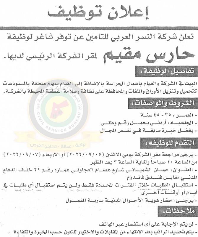 أعلنت شركة النسر العربي للتأمين حاجتها لحارس لمقر الشركة الرئيسي.