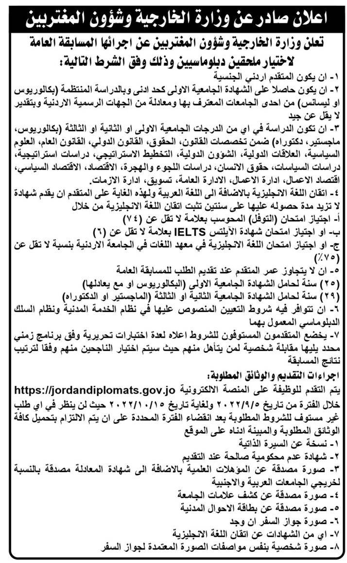 وتشترط الوزارة أن يكون المتقدم أردني الجنسية وحاصلا على الشهادة الجامعية الأولى كحد أدنى وبالدراسة المنتظمة ضمن تخصصات؛ القانون، الحقوق، القانون الدولي، القانون العام، العلوم السياسية، العلاقات الدولية، الشؤون الدولية، التخطيط الاستراتيجي، دراسات استراتيجية، دراسات السياسات، حقوق الإنسان، دراسات اللجوء والهجرة، الاقتصاد، الاقتصاد السياسي، اقتصاد الأعمال، إدارة الأعمال، الإدارة العامة، التسويق، وإدارة الأزمات.